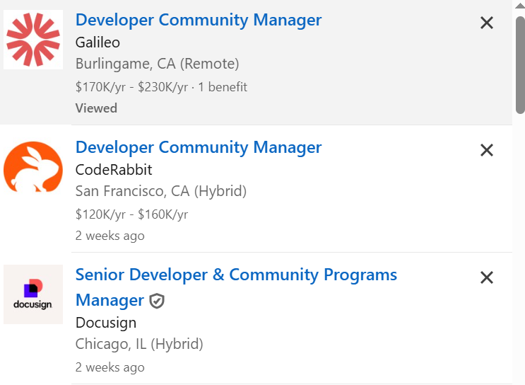 The job descriptions tell the story. Tag is looking for someone who can foster engagement in open-source communities, build relationships with developers, and serve as a peer-to-peer resource on platforms like GitHub and Stack Overflow. Another company, Galileo is hiring people who know how AI applications are built, can run forums and hackathons, and keep developers connected and learning from one another. Databricks is seeking similar candidates with a deep background in data analytics. These are not lightweight roles; they require real coding experience and credibility. Salaries range from $120k - $250k.